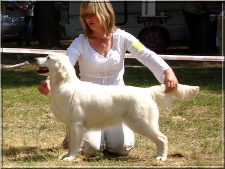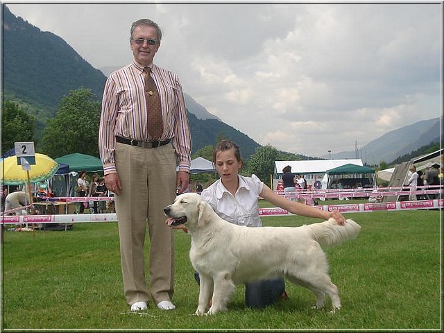 Predivna kujica, lijepa glava, dobra pigmentacija, dobra dlaka, dobri prednji i stražnji kutovi, odlično izbalansirana s odličnim kretanjem. Pred kujicom je blistava budućnost.